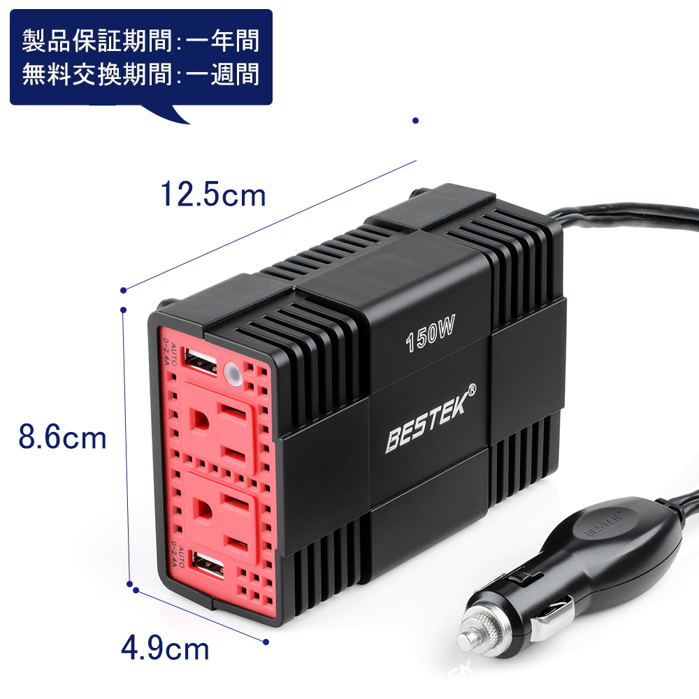 BESTEK カーインバーター 150W シガーソケット充電器 カーチャージャー 12V車対応 AC 100V 車載コンセント USB 2.1A 2ポート矩形波 地震 震災 防災用品 グッズ パワーサプライ 【取扱終了】