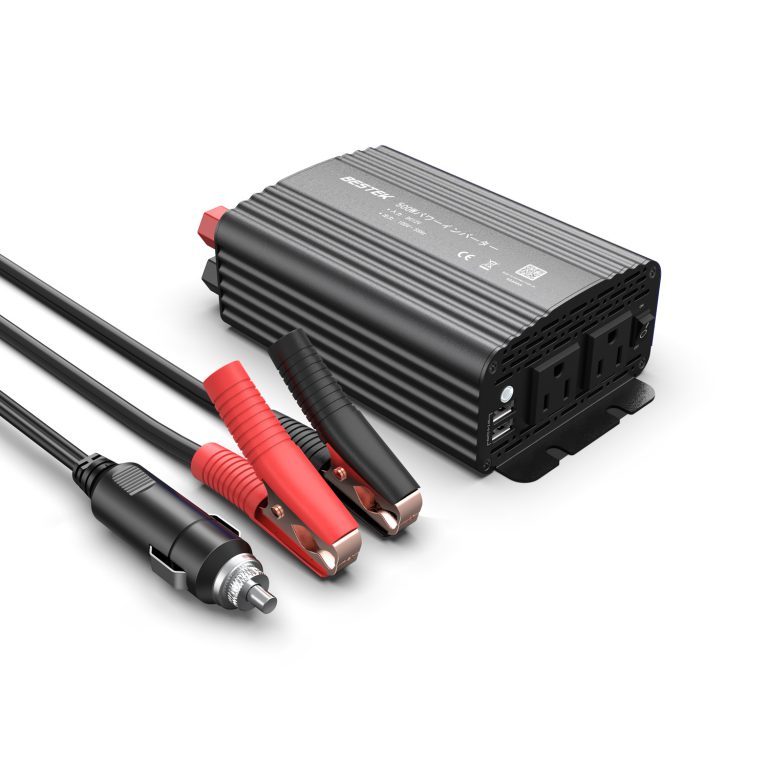 【パワフルな出力】自動車のバッテリーのDC12V直流電力をAC100V交流電力に変換して定格消費電力500Wの電子機器に給電可能です。ACコンセント×2口(AC100V出力)、USBポート×2口(DC5V 0~2.4A