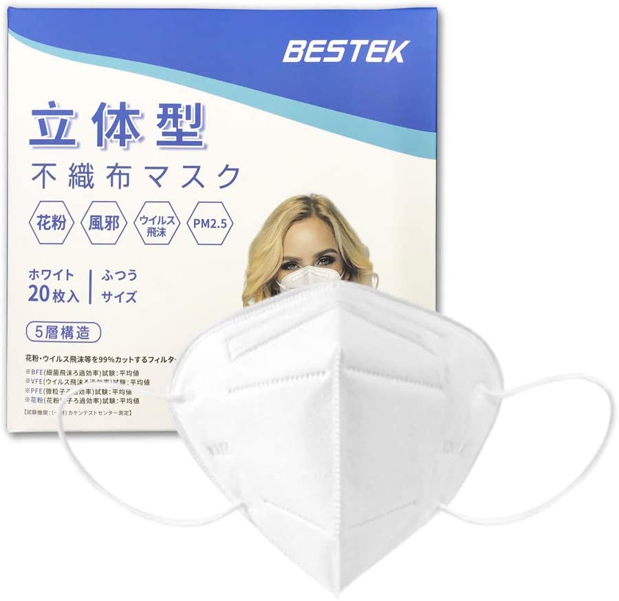 BESTEK 丸紐 20枚入 マスク 立体型不織布マスク 5層構造 ウィルス対策 花粉カット 飛沫防止 防塵抗菌 PM2.5対応 【取扱終了】